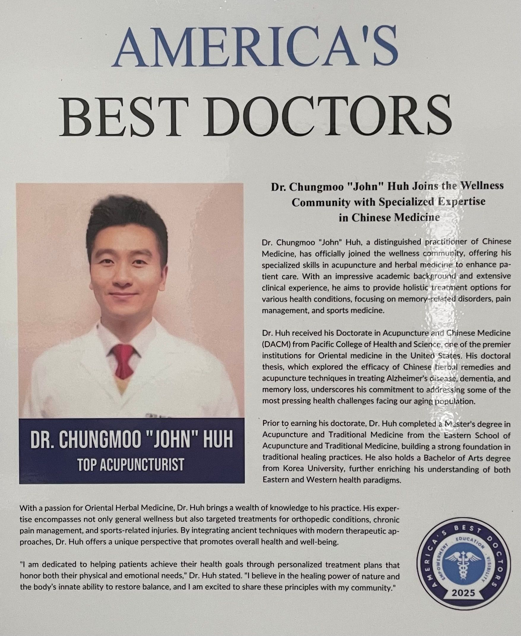 John received his Doctorate in Chinese Medicine with a specialization in Chinese Herb and Acupuncture from Pacific College of Health and Science, one of the top Oriental medical schools in the United States. His thesis was on Chinese Herb and Acupuncture for Alzheimer's, Dementia, and Memory loss.